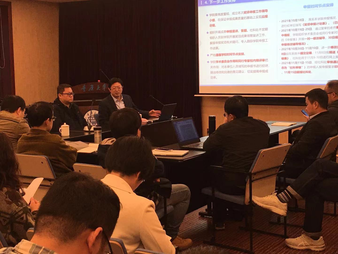 重庆市第十一次社会科学优秀成果奖、第八届重庆市发展研究奖申报在即,为提升申报质量,学校社科处处长袁文全、项目与成果办公室副主任殷铭泽于2021年10月28日中午到文字斋学术报告厅为免费av
