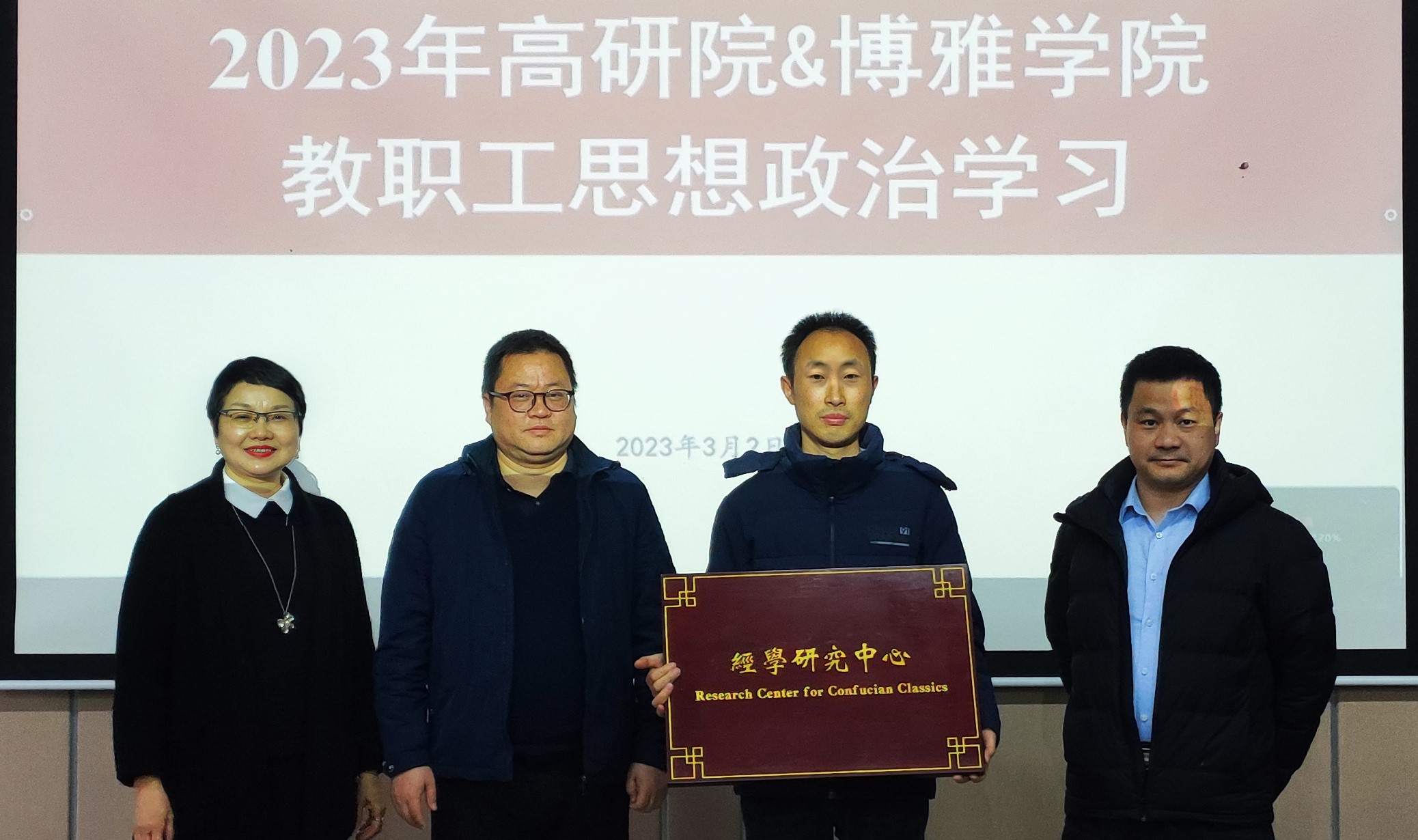 &人文社会科学高等研究院召开全院大会,正式宣布哲学系成立“古典文明与政治哲学研究中心”、“现象学与第一哲学研究中心”与“经学研究中心”,学院领导为新成立的研究中心颁发了牌匾。三个研究中心的成立,旨在结合自身优势,进一步激发创新思路与科研活力,形成多点突破,支撑学科建设,是哲学系凝练特色、踔厉发展的又一阶段性标志。