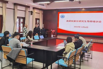 为全面落实研究生导师(以下简称“导师”)立德树人职责,加强研究生指导教师队伍建设,着力提升研究生导师的指导能力和业务水平,2024年12月6日下午,学院在博雅小院学术报告厅举行了“2024年新任研究生导师培训会”。学院副院长唐杰、教学督导组长吴德垠教授、6名新任研究生导师和教学办主任夏璐璐参加了培训会。