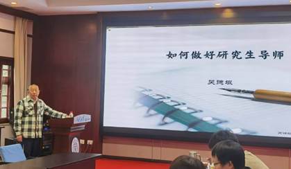 从招生录取到毕业离校共14个方面的培养相关规定。接着他就如何做好研究生导师情真意切地分享了30多年来的研究生教育人经验,深入浅出地阐述了导师的责任与担当。他表示,要做好研究生导师,打铁就得本身硬,因此,导师首先要认真学习、努力工作和勇于实践,以提高自身素质和能力,做到政治素质过硬、师德师风高尚、业务素质精湛;其次,导师要明确立德树人是根本,并同时了解和建设研究生成长的相关条件和环境。最后,吴德垠重点从了解研究生特点、搞好和谐融洽的师生关系、指导研究生的主要途径、指导风格与模式探讨四个方面与参与培训老师共同探讨了研究生指导方法。