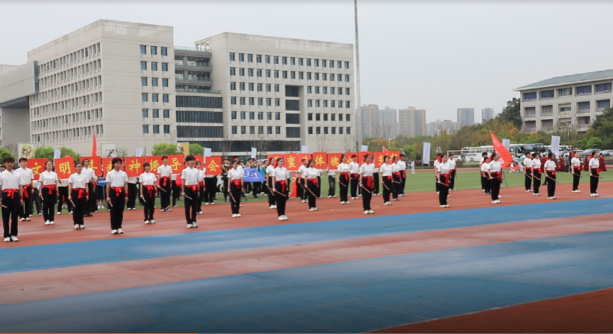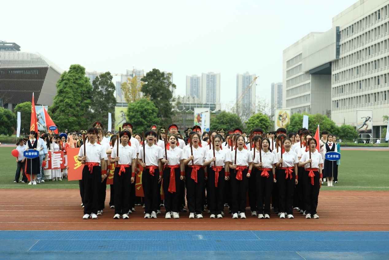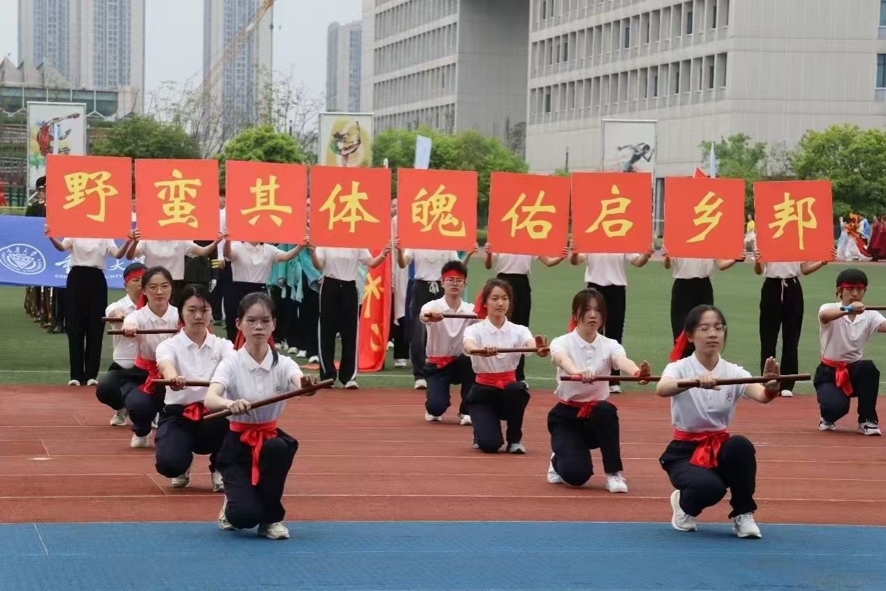 在开幕式上,博雅学子身着白衣黑裤,手持短棍列阵而立。随着《武林风》的铿锵乐声响起,棍影上下翻飞,劈、扫、挑、刺等动作虎虎生风,时而如疾风掠地,时而似惊涛拍岸,刚柔并济的表演引得全场师生阵阵喝彩。在舞棍同学的身后,“文明其精神,振导社会;野蛮其体魄,佑启乡邦“的标语,彰显着博雅学子强身筑基、修德立心的决心和振兴乡土、开创未来的使命担当。表演环节结束后,“青春疾驰,运动启航,博雅学子,斗志昂扬”的口号在运动场上响起,充分展现全体博雅学子的蓬勃朝气。