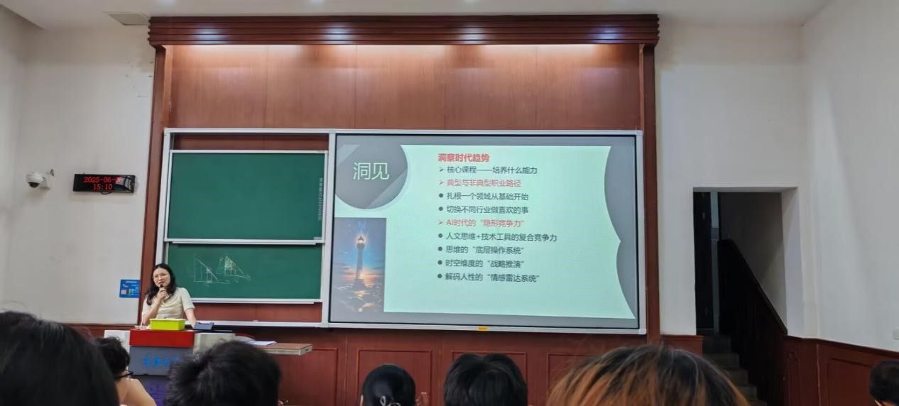 会议伊始,高老师以“洞见”为切入点,结合当前就业市场形势,分析未来的行业发展趋势。她指出,我们应当透视内心热爱,发掘自己的职业兴趣,同时洞察时代趋势,找到在AI时代的文科隐形竞争力。“大学不仅是学习知识的阶段,更是培养核心竞争力的关键时期。”高老师强调,“同学们要尽早了解行业动态,结合自身兴趣和专业特点,制定清晰的职业目标。”高老师还鼓励同学们利用职业测评工具(如MBTI、霍兰德职业兴趣测试)探索个人职业倾向,并结合自身优势制定个性化成长路径。她建议同学们通过社会实践、企业参访、行业讲座等方式,拓宽视野,增强对职业世界的认知。