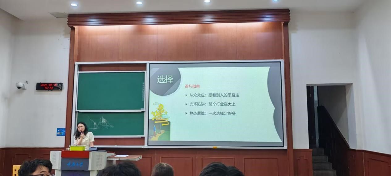 在“选择”环节,高老师强调,职业兴趣是指引职业发展的内在动力。她通过案例分享,阐述了兴趣与职业匹配的重要性:“如果你对某个领域充满热情,即使遇到困难,也会更有动力去克服;反之,若仅因薪资或社会评价选择职业,可能会在长期工作中感到倦怠。” 她指出,我们应当以职业为导向进行专业选择,通过列举文史哲专业分别对应的传统和新兴职业,并讨论从事这些职业所需要的各项能力。