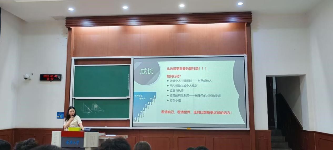 比“选择”更重要的是“行动”,只有行动起来才会一步步收获成长。高老师围绕“成长”主题,建议同学们结合AI工具,根据性格特点、兴趣方向、职业期待及家庭因素等进行个人短期、中期、长期职业规划;过程中做好执行监督,定期开展回检,审视个人的成长进步并及时调整方案;积极参加社会实践,学习编程、外语、PPT制作、视频剪辑等实用技能,增强自己的竞争力。