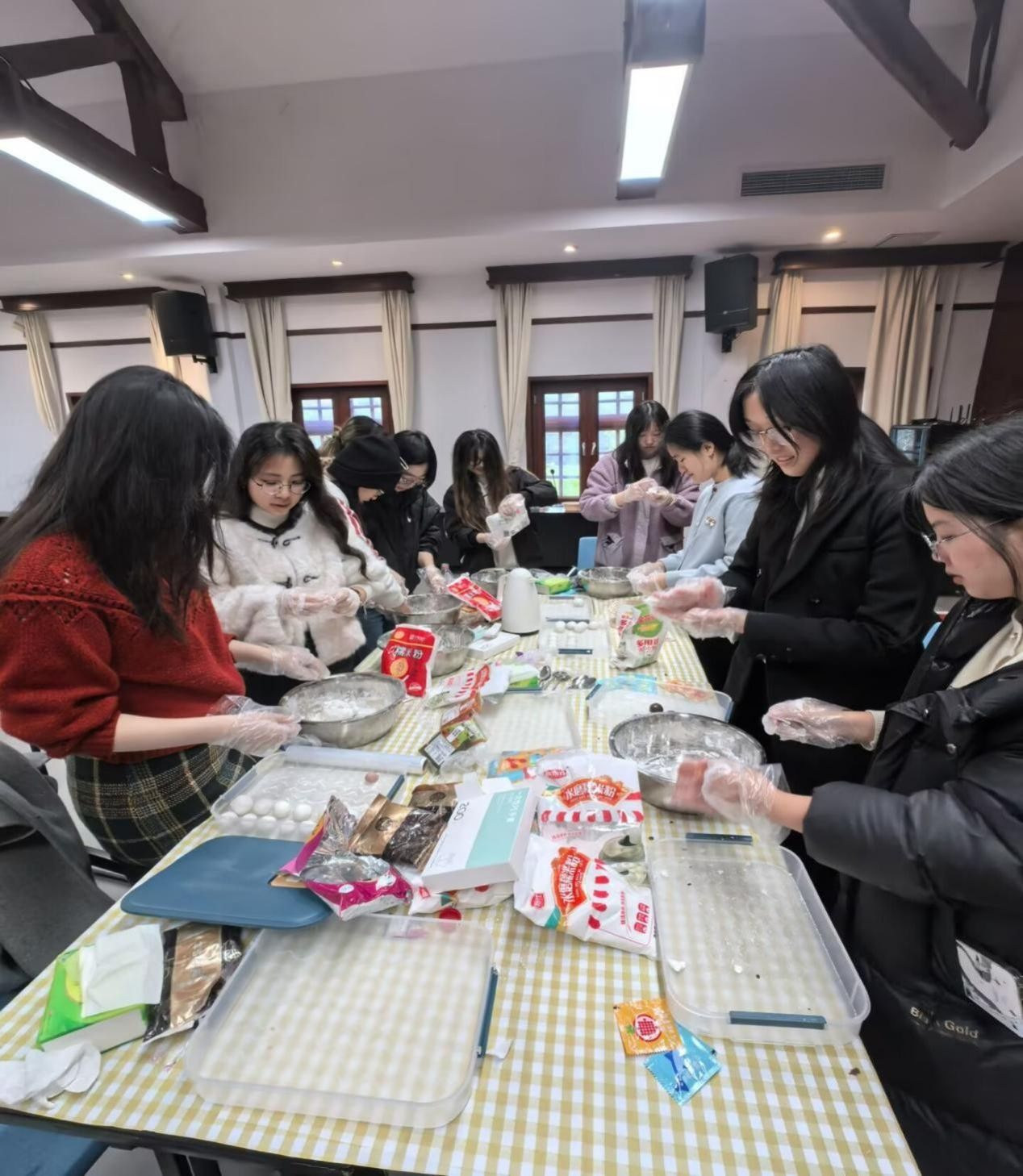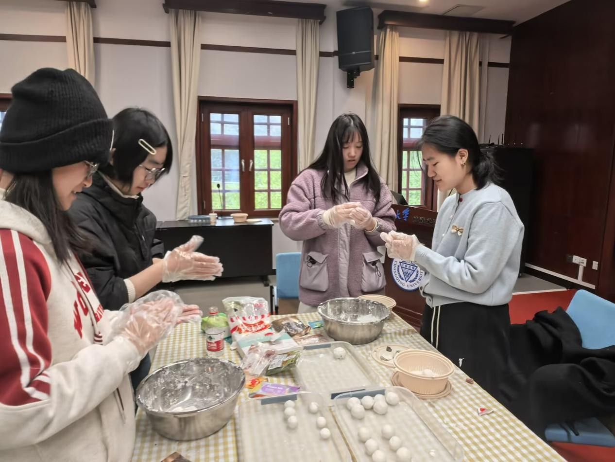 包汤圆区域笑语盈盈,来自五湖四海的学生围坐一团,揉面团、搓圆球、填馅料,一双双巧手将思念与期盼包进软糯的汤圆里。大家一边操作,一边分享家乡的冬至习俗:北方的饺子寓意“捏冻耳朵”,南方的汤圆象征“团圆美满”,不同地域的文化碰撞在小院里交融共生。按照活动安排,每人精心制作八个汤圆,交由食堂加工后,由志愿者送至宿舍楼下,让这份亲手制作的温暖精准传递到每位参与者手中。