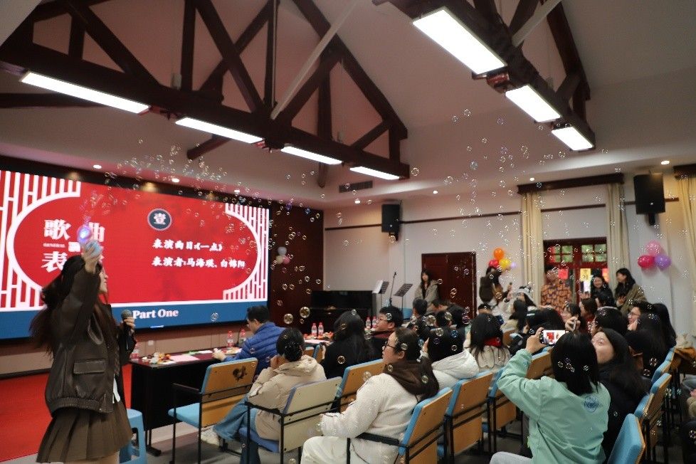 本届游园会设置室内演出与户外游园两大板块。室内表演以白锦阳、马海瑛合唱《一点》开场,陆续呈现了独唱《平庸》、舞蹈《触摸天空》等多元节目。后续费璐思《Angels We Have Heard on High》、左欣扬与康贵凝器乐合奏《诀别书》、马海瑛与殷子瑞对唱《如果爱忘了》及江南帅原创歌曲《一万遍晚安》等节目各具特色,阳卿、马熙勤等同学表演的音乐剧《Alexander Hamilton》将现场气氛推向高潮。室内表演在师生合影中圆满结束。