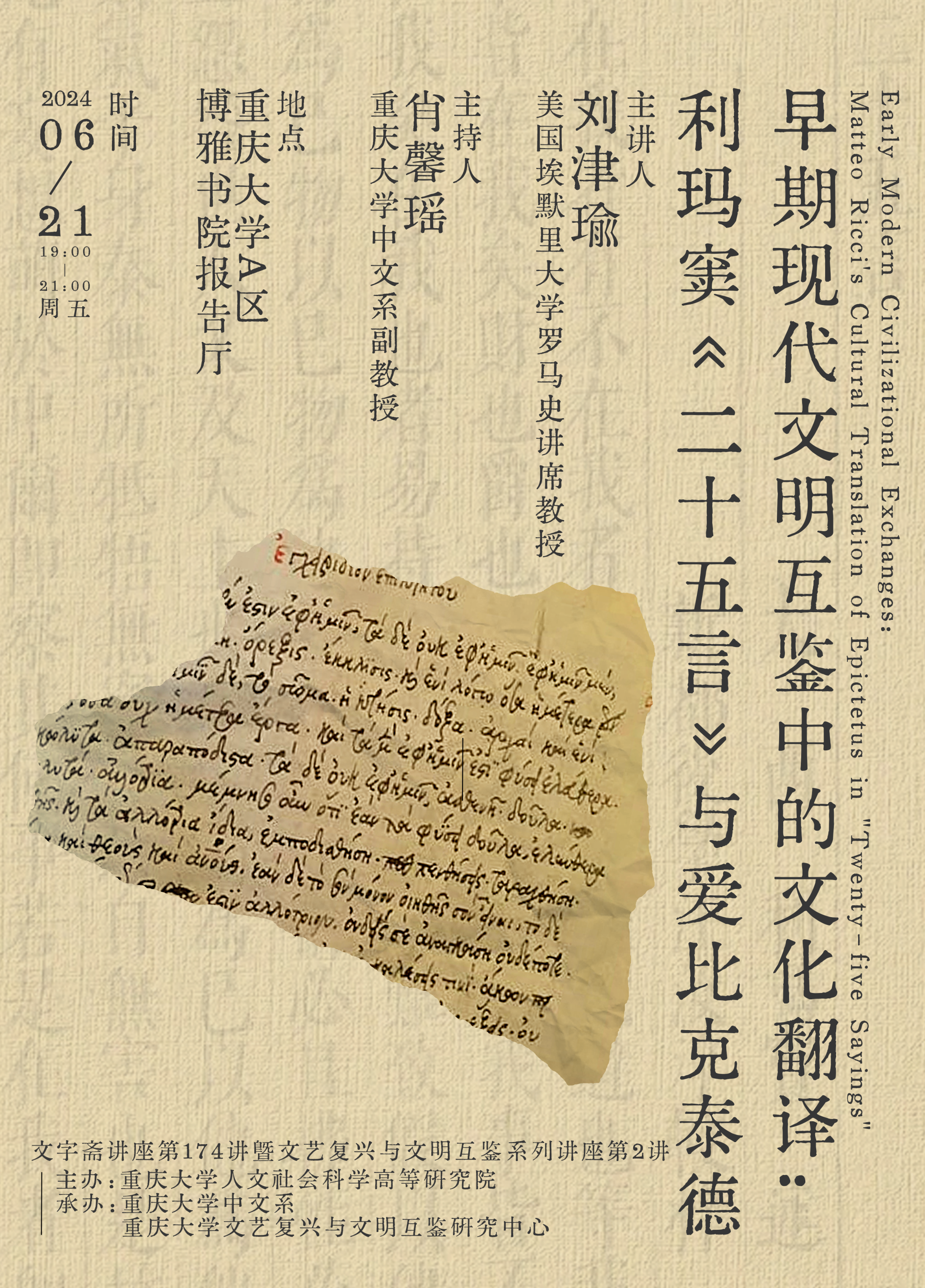 利玛窦的《二十五言》(1599年译,1604年刊)可以溯源到罗马时代哲学家爱比克泰德的《手册》(Enchiridion),但两者之间应该有中间版本,而且《二十五言》和晚明耶稣会士的中文“译本”一样,对“源”文本干预甚多,干预手法包括拣选、添加、删减、替换、重写,等等。本次讲座通过对比利玛窦《二十五言》、爱比克泰德《手册》的希腊文本、《手册》经天主教转化的希腊文文本、《手册》的拉丁文文本,来探讨不同历史时段、不同文化背景、不同的书写者对《手册》的增删、改写与提炼,在此基础上论证利玛窦的《二十五言》是一篇带有强烈“主动性”的文本:它不但重置了爱比克泰德思想中的关键概念,并且将儒家经典中的关键概念置于新的语义关系网络中,以此重新构建这些关键词的内涵与外延。此外,《二十五言》似乎刻意选取了儒家讨论较多、争议性较大的历史案例,目的或许正是为了激起读者对文本做出反应。