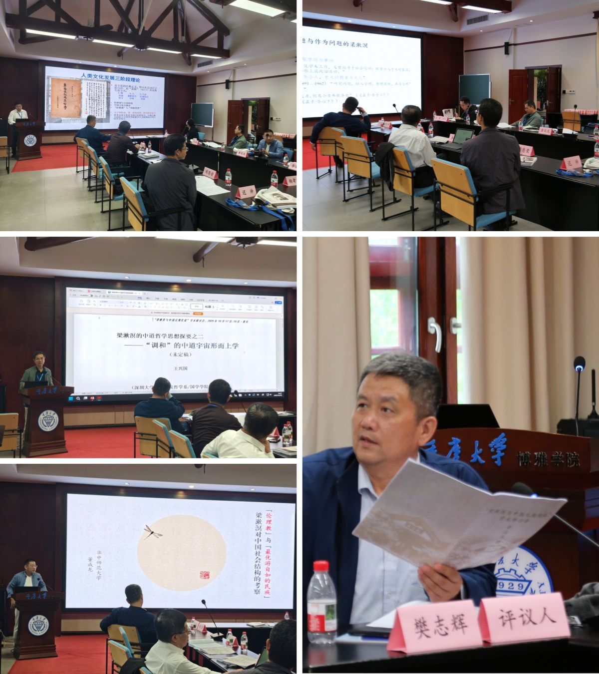 哲学系田探副教授主持,西南大学哲学系张爱林副教授担任评议人,云南师范大学哲学系李广良教授、西南大学哲学系单正齐教授、陕西师范大学哲学学院曹树明教授、江西省社会科学院《江西社会科学》龚兵老师、西南大学哲学系吴祖刚副教授先后发言。大家围绕梁漱溟佛学思想的“因缘”与“终极识度”、梁漱溟儒佛会通观及儒释道三教关系论、方东美对华严宗法界圆融观的现代诠释以及中华文明和平性的心论基础等相关议题展开了研讨。