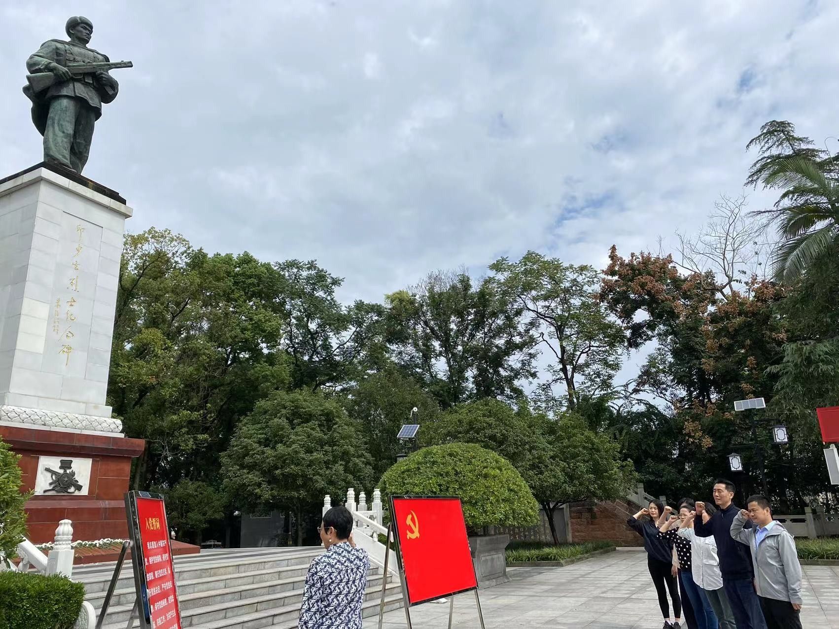 参观结束后,同志们前往邱少云烈士纪念广场,在他的雕像面前进行预备党员宣誓和党员重温入党誓词活动。全体党员在学院党委书记曾佐伶的带领下,高举右拳,面向鲜红的党旗庄严宣誓,表达了作为一名党员不忘入党初心、牢记职责使命的坚强决心。