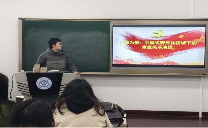 教师张华的论文《“团结生产”:1950年婚姻法实施与新家庭建设研究》,从史学、哲学等角度进行了深入思考。会上集体学习时,领学成员王豪凯带领大家回顾了从古至今家庭关系的历史变革历程,从古代传统儒家的家庭伦理构建,到晚清民初的家庭革命与新中国时期的家庭改造,再发展到当今中国式现代化视域建设下国家对家庭家教家风建设的重视与提倡,新时代下,党和国家努力使家庭成为国家发展、社会进步与民族和谐的重要基点。