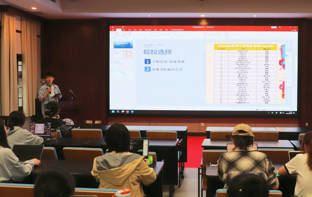 第一部分是留学经验分享。2020级法学专业的万宇骁以自己的经历为例,详细介绍了留学申请的准备工作。在院校选择方面,他希望同学们要明确留学目的,并分享了获取相关院校和专业信息的平台。万宇骁还分享了自己在准备语言考试过程中的心得,提醒同学们要尽早完成相关的实习和调研工作。针对同学们提出的问题,他也分析了跨专业申请留学的可行性。