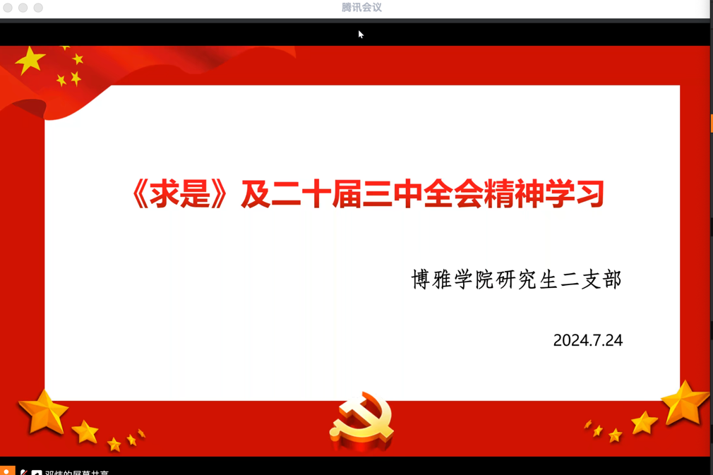 研究生二支部通过腾讯会议开展了“共读《求是》杂志,深入学习二十届三中全会精神”线上学习活动。本次活动由高波同志主持,支部全体党员、发展对象及入党积极分子积极参与学习讨论。