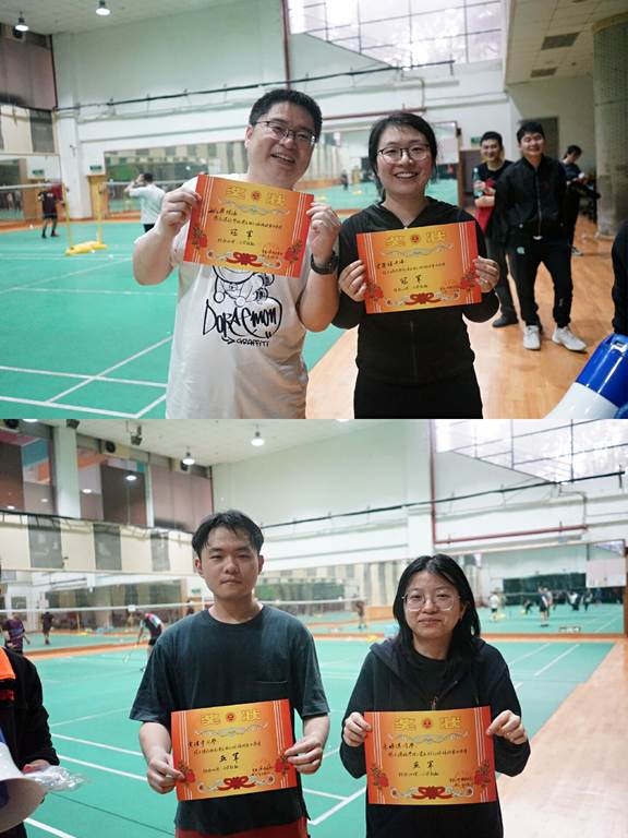 大战一触即发,决赛对阵的四名选手为围观的师生呈现了一场高质量的演出。双方攻防转换速度极快,腾空扣杀、倒地救球的吸睛戏码亦频繁上演,现场观众惊呼叫好声此起彼伏,宛若置身林李大战的奥运赛场。经过三局苦战,姚飞/肖馨瑶的教师组合最终棋高一着,力克黄佳宇/朱雅淇的学生组合,勇夺首届羽毛球锦标赛冠军。赛后在博雅分工会主席郭畑的主持下,为冠、亚、季军的八位选手颁发了奖状和奖品。