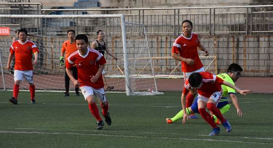 比赛前半个小时,身着红色球衣的老师们早已开始准备热身、商量战略,期待一展身手。随着裁判的一声哨声,球场上顿时沸腾起来。我方队员不断组织进攻,攻势逼人,一度打乱对方阵脚。然而,对方抓住时机,只见角球传中,进了一个头球。但我方队员心态保持较好,频频将球带入对方后半场。可惜的是,我方四次有威胁性的进攻不是撞球柱,就是被扑出。场边观看比赛的师生连连跺脚、直叹可惜。这时,上半场比赛也以落后一球结束。