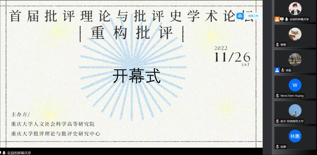 2022年11月26日,“重构批评:首届批评理论与批评史学术论坛”在线上成功举办。本次论坛由免费av 人文社会科学高等研究院&免费av 主办,免费av 批评理论与批评史研究中心承办,邀请到了国内在文艺批评实践与研究领域深有研究的20余名专家学者出席,围绕“重构批评”主题展开了热烈研讨。来自全国各大高校众多师生在线上旁听了本次论坛。