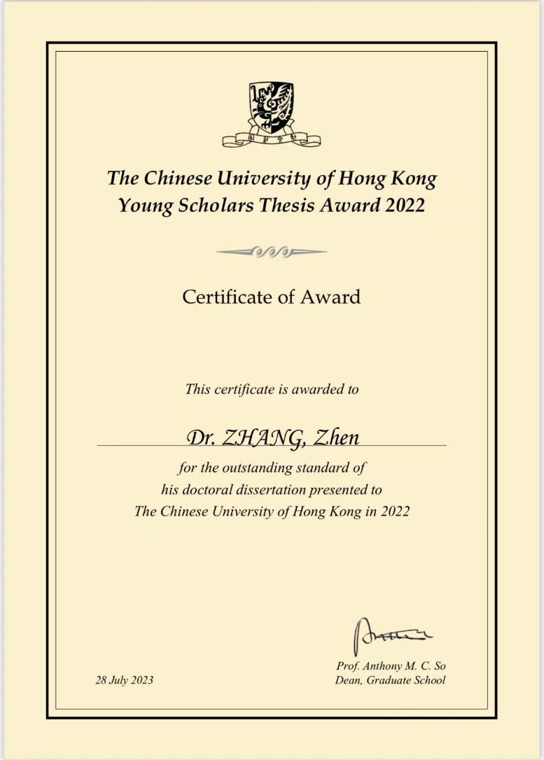中文系张振老师荣获“香港中文大学青年学者论文奖”