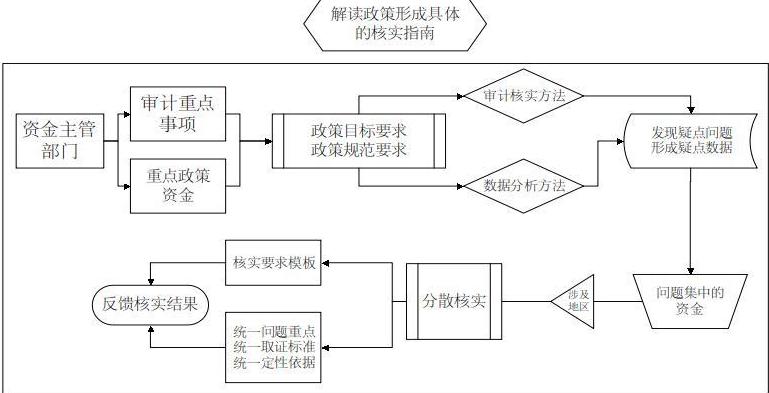 一方面试审先行。在有针对性地选择两个县(市、区)开展试审基础上,围绕“一卡通”平台管理、违规资金核实、政策目标评价等,形成详细“审计核实指南”(图1),利用县(市、区)审计机关力量,与预算执行或民生审计项目共同开展。实现了问题重点、取证标准、定性依据的三统一,更提高了审计核实问题精准度。另一方面将重点核实和全面覆盖结合。在现场抽查核实后,针对疑点集中的水库移民直补资金、农业生产补贴等,形成详细的主管部门“核实要求模板”。明确各项疑点的核实内容和需提供的证据资料等,便于审计人员逐项准确落实疑点,有效保证核实速度和质量,实现疑点核实的全覆盖,确保发现问题的普遍性和严谨性,实现查出问题有深度、有力度。